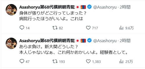 元朝青龍「本人じゃないなぁ、これ何かおかしいよ」初の負け越し危機の安青錦に病院行きの勧め 力士ニュース X Facebook はてブ LINE Pinterest コピー 2026.03.19 元朝青龍「本人じゃないなぁ、これ何かおかしいよ」初の負け越し危機の安青錦に病院行きの勧め モンゴル出身の元横綱、元朝青龍のドルゴルスレン・ダグワドルジ氏(45)が19日、Xを更新。春場所で5勝7敗と初の負け越し危機に陥った大関安青錦(21=安治川)… – 日刊スポーツ新聞社のニュースサイト、ニッカンスポーツ・コム(nikkansports.com) 記事全文を読む ↗